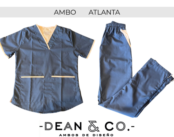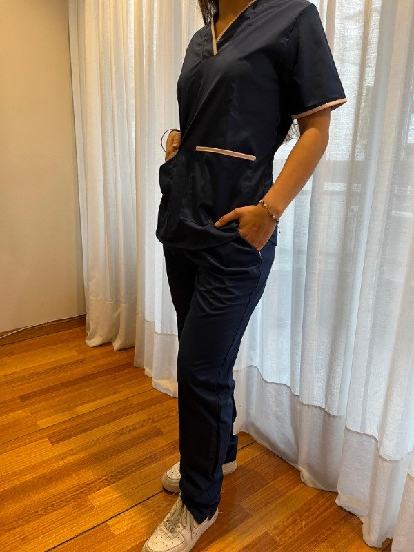 - Pantalón recto AZUL MARINO con detalles en ROSA, con bolsillos laterales, y aberturas en el dobladillo. Cintura con elástico en todo el recorrido y cordón interno para regular talle.