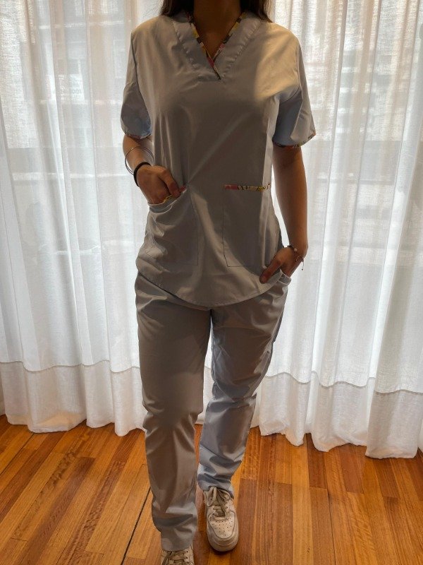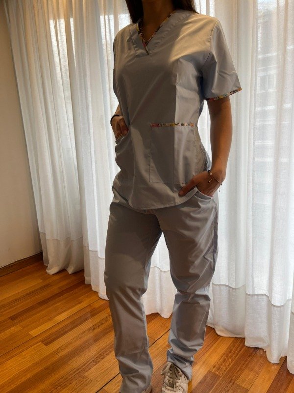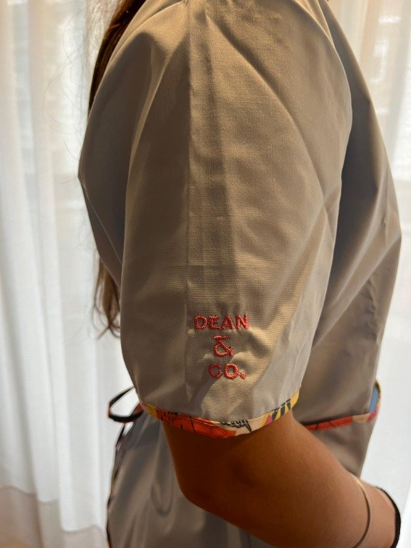 - Casaca con cuello en V en color CELESTE con vivos en ESTAMPADO, con bolsillos DELANTEROS grandes.Tira en espalda para regular talle. Y bolsillo interno para guardar celular.