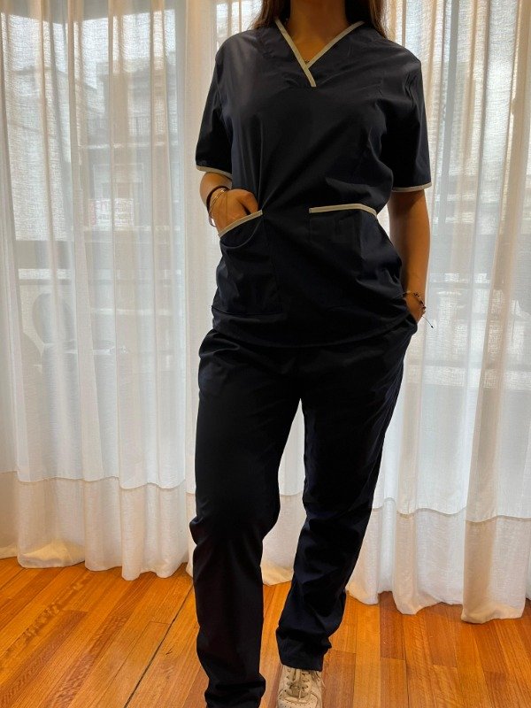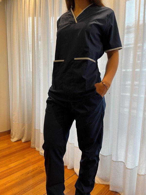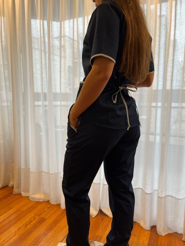 - Casaca con cuello en V en color AZUL MARINO con vivos en CELESTE, con bolsillos DELANTEROS grandes.Tira en espalda para regular talle. Y bolsillo interno para guardar celular.
