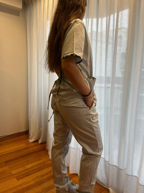 - Pantalón recto GRIS con detalles en ESTAMPADO, con bolsillos laterales, y aberturas en el dobladillo. Cintura con elástico en todo el recorrido y cordón interno para regular talle.