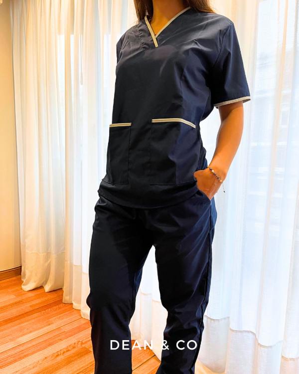 - Casaca con cuello en V en color AZUL MARINO con vivos en CELESTE, con bolsillos DELANTEROS grandes.Tira en espalda para regular talle. Y bolsillo interno para guardar celular.