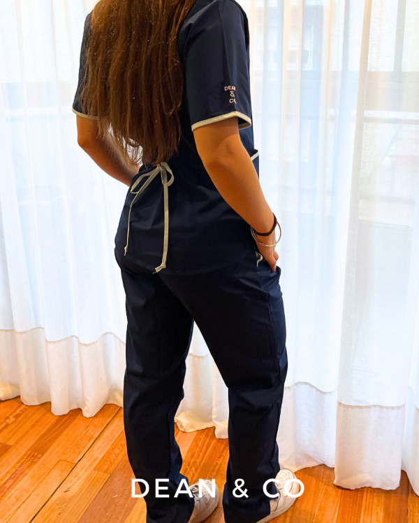 - Pantalón recto AZUL MARINO con detalles en CELESTE, con bolsillos laterales, y aberturas en el dobladillo. Cintura con elástico en todo el recorrido y cordón interno para regular talle.